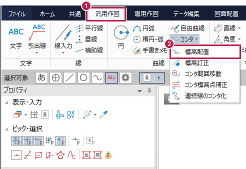 A:高さの情報を持ったコンタ線には[汎用作図]タブ-[曲線]-[コンタ]-[標高配置]で配置してください。高さを持たないコンタ線には[標高訂正]で高さを与えてから[標高配置]をおこなってください。