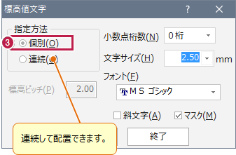 - [標高値文字]の「個別」を選択します。