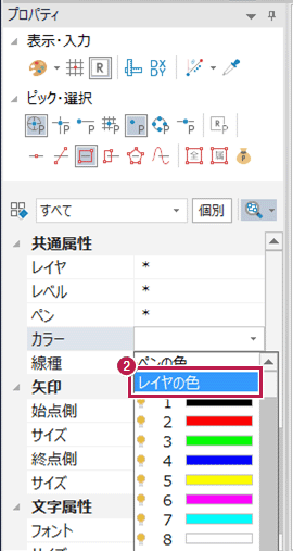 - [プロパティ]-[共通属性]-[カラー]を[レイヤの色]に変更します。