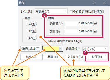 - 面積を確認し、必要に応じて色の追加や面積の値の配置をおこなってください。