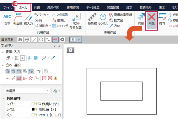 - [ホーム]タブの[削除]で最初に描いた線を消してください。