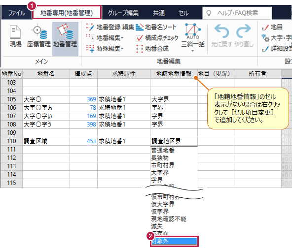 - [地籍地番情報]で「調査地区界」が設定された地番を確認し、ダブルクリックして他のものに変更します。