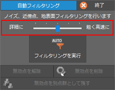 自動でノイズフィルタリング、近傍点フィルタリング、地表面フィルタリングをおこない、無効点を設定します。