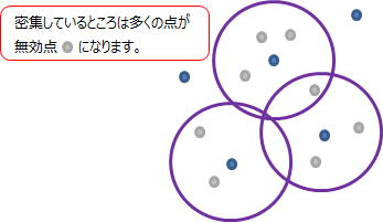 近い距離の点を無効点とします。点の密度が低いところは無効点になりにくく、点の密度の高いところは多くの点が無効点になります。