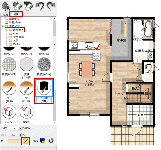 ※ 一部の壁の色を変更したい場合は、「効果」タブの「手動レタッチ」の「部分レタッチ」にある「ブラシ塗り(四角)」などを使用して変更できます。