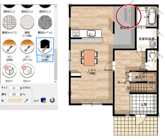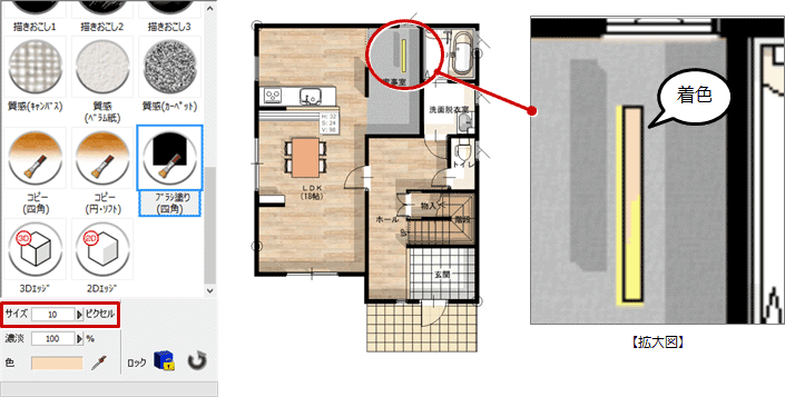 - 「サイズ」でピクセルを調整し、変更したい壁に着色します。