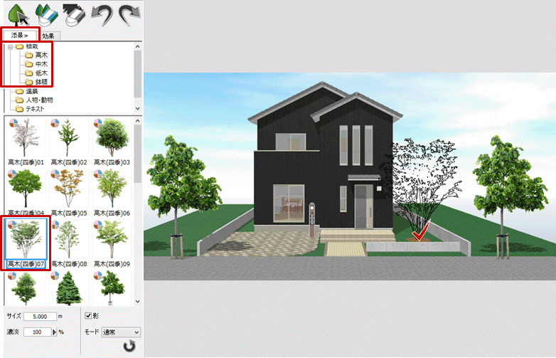 A:「添景」タブを選び「植栽」にある樹木を選択して入力します。