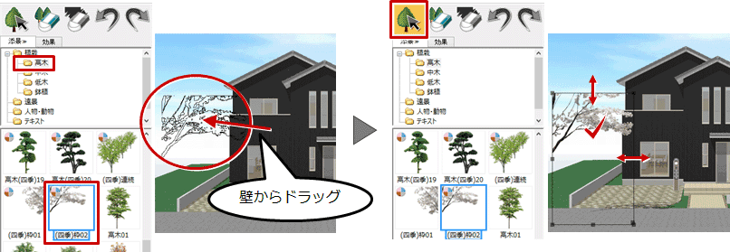 「(四季)枠01」「(四季)枠02」は、壁からドラッグして配置した後、「添景の選択」を選び、配置した添景をクリックして、移動やサイズ調整などの編集をします。