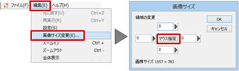 - 「画像サイズ」ダイアログの「マウス指定」をONにします。
