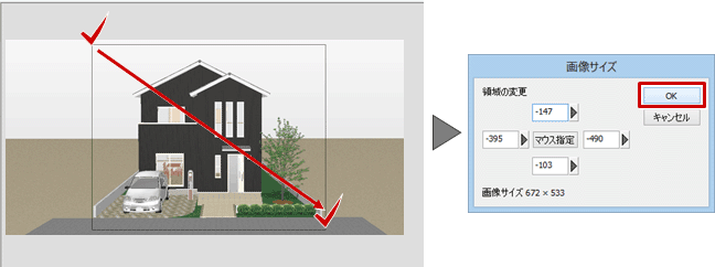 - マウスでトリミングしたい部分の範囲を指定して、「画像サイズ」ダイアログの「OK」をクリックします。