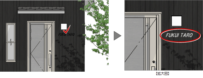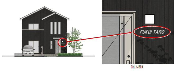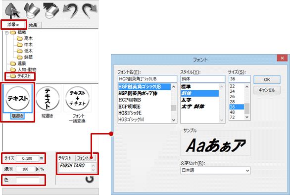 A:「添景」タブの「テキスト」を選び、サイズやフォント、文字列を設定して入力します。