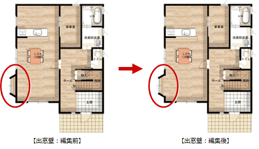 A:出窓壁と部屋が接する部分には壁が作成されてしまうため、連携後、「効果」タブの「手動レタッチ」の「部分レタッチ」にある「コピー(四角)」を使用して不要な壁を消してください。
