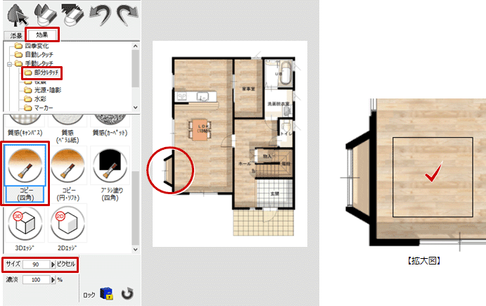 - 「効果」タブをクリックして、ツリーから「手動レタッチ」の「部分レタッチ」を選びます。
