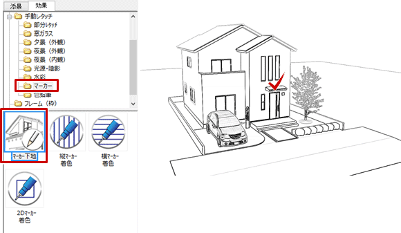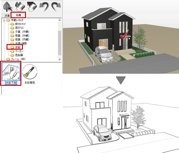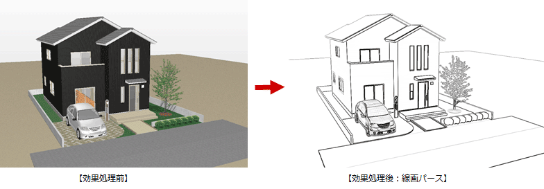 A:白抜きの線画パースを作成する機能はありません。「効果」タブの「手動レタッチ」の「水彩」や「マーカー」の下地を使用して、代用することができます。
