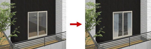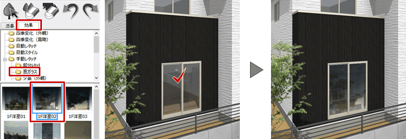 - 異なる窓ガラスを試すときは、変更する窓ガラスの効果を選んで「再適用」をクリックすると、効果が入れ替わります。