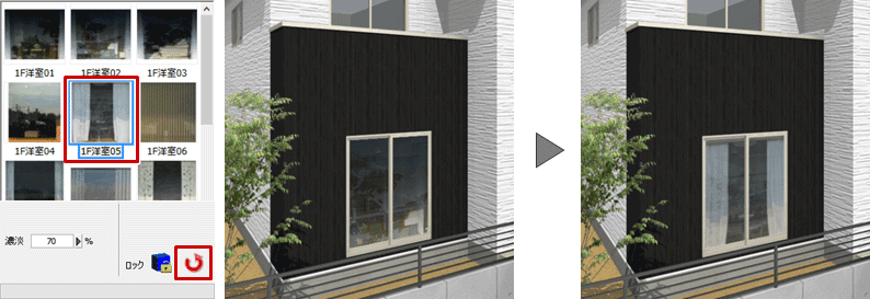 横長の画像の効果パターン(「1F洋室08」や「2F洋室01」など)は窓建具向きです。