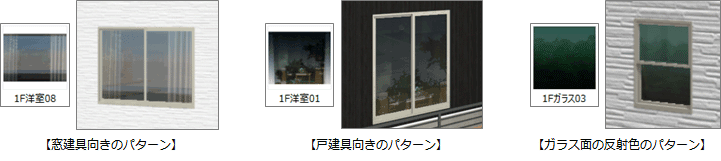 正方形の画像の効果パターン(「1F洋室01」や「2F洋室02」など)は戸建具向きです。「○Fガラス**」 ガラス面の反射色に関するパターンです。