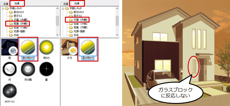A:ガラスブロックは「窓の明かり」の対象外となっているため、効果が出ません。「窓の明かり」の対象となるのは、ArchiMaster建具と3Dカタログ建具のガラス面です。
