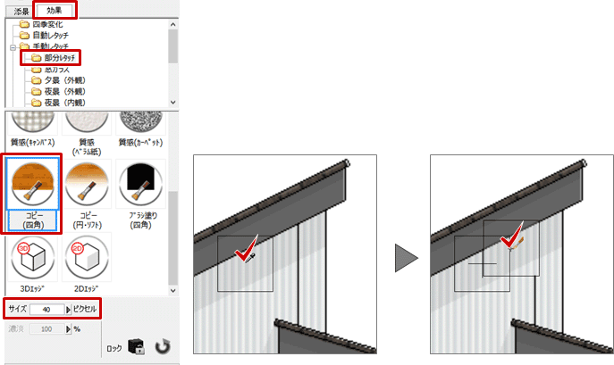 A:「効果」タブの「手動レタッチ」の「部分レタッチ」にある「コピー(四角)」を使うと、部分的なコピーができます。