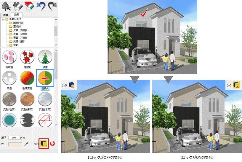 A:「ロック」をONにすると、一定の方向を向いている特定の面のみを対象として、ペイントの効果を与えることができます。