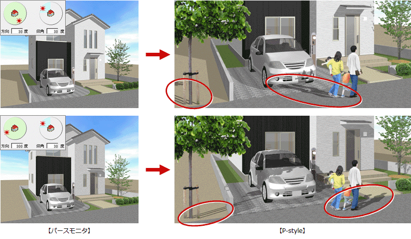 A:パースモニタやパーススタジオで設定した太陽光の向きが連動して、影が描画されます。