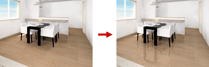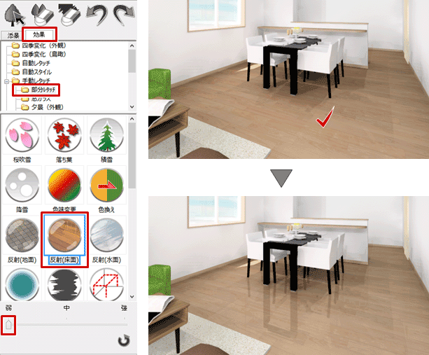 A:「効果」タブの「手動レタッチ」の「部分レタッチ」にある「反射(床面)」を使って、床面に光沢を与えることができます。