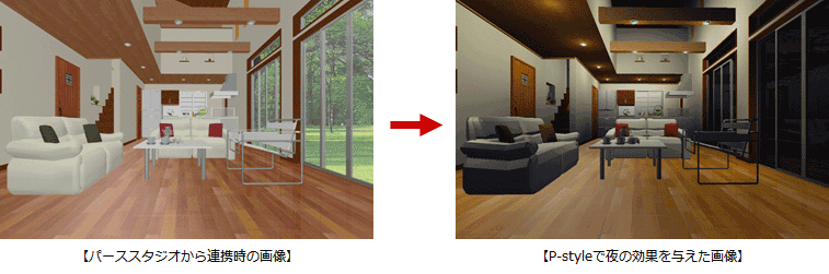 ※ P-styleで夜の効果をかける場合は「通常光」の設定でかまいません。 - 太陽光が差し込んでいると夜のパースとして不自然なため、太陽光の向きを変更するか、「太陽光」をOFFにします。