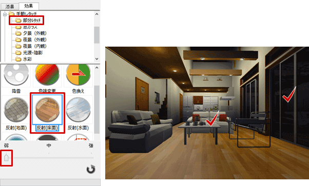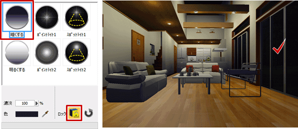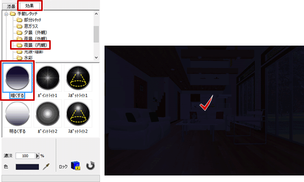 A:「効果」タブの「手動レタッチ」の「夜景(内観)」の効果を使って、昼のパースから夜のパースに変更することができます。