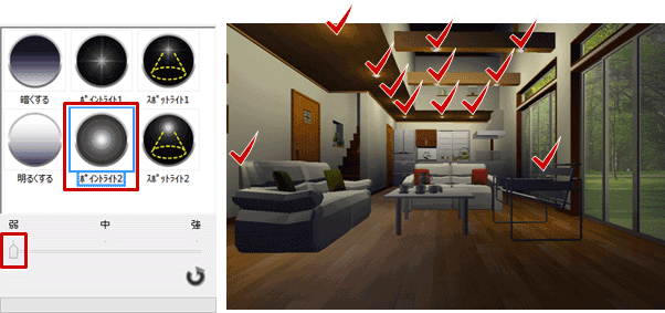 ※「ポイントライト1」は十字型、「ポイントライト2」は円形のライトを表現します。 - スライダを「弱」に変更します。