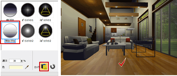 - 床や天井などをもう少し明るくしたい場合は、一覧から「明るくする」を選びます。