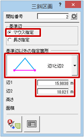 ※ 三角形のどの部分の情報があるかによって指定箇所のタイプを選びます。なお、底辺と高さのみの情報では三角形の形が確定できないため、三斜区画を作成できません。 - 「辺1」には「15.446」、「辺2」には「19.182」と設定します。