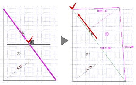 - 順にクリックをすると「長さ指定」で設定した長さ、「辺1」「辺2」で設定した長さの三斜区画が作成されます。