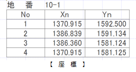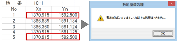- 座標値の最初と最後が同じ値の場合、最後の座標値は「敷地座標入力」ダイアログの点数に含めません。次図の場合、点数を5にして入力すると、メッセージが表示され敷地を入力できません。