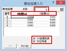 - 「敷地座標入力」ダイアログで、「点数」を「4」と入力し、「X座標(m)」「Y座標(m)」項目の単位がmになっているのを確認します。