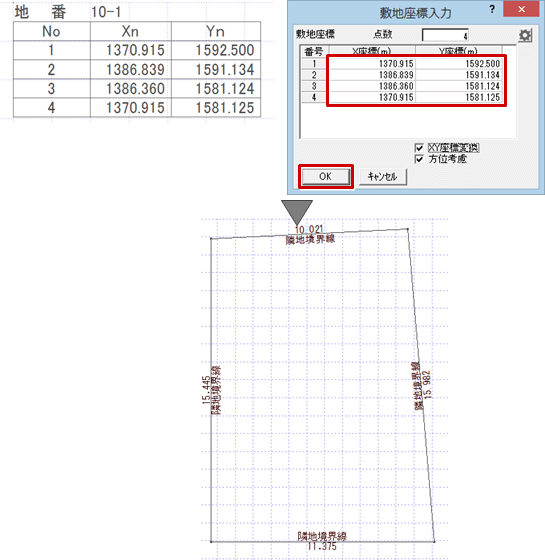 ※ 方位マークが入力されている場合に、「方位考慮」をONで敷地を座標入力すると、座標点1と2を結んだ敷地辺が、方位マークで設定された北方向と平行になるように入力されます。 - 座標値を参照しながら、「敷地座標入力」ダイアログの各番号に座標値を入力して、「OK」をクリックします。