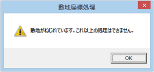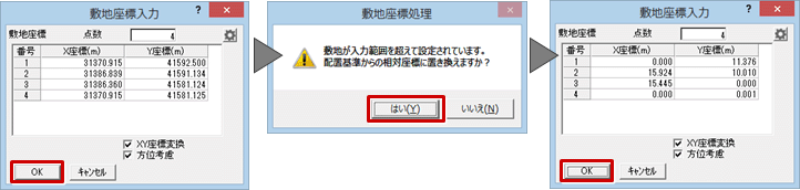 指定した座標値が入力可能な範囲を超える場合、「敷地座標処理」ダイアログが表示されます。「はい」をクリックすると、入力可能な範囲に座標が変換され、「敷地座標入力」ダイアログに戻るので、確認して再度「OK」をクリックします。