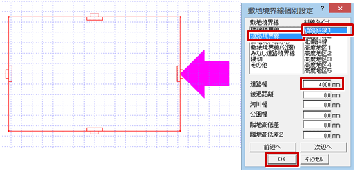 - 「敷地境界線個別設定」ダイアログの「敷地境界線」で「道路境界線」「斜線タイプ」で「道路斜線1」を選び、「道路幅」を設定します。