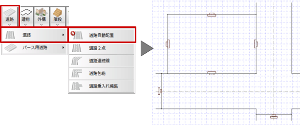 A:「敷地」メニューの「敷地境界線」の「個別設定」で道路境界線を設定し、「道路」メニューの「道路」の「道路自動配置」で作成します。