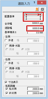 ※「道路2点」で、始点と終点を指定して入力することもできます。 - 「道路入力」ダイアログの「配置基準」「道路幅」などを設定します。