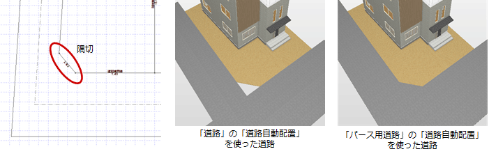 - 隅切のある2方向道路の場合、「道路」メニューから「道路」の「道路自動配置」ではパースで隅切り部分の道路を表現できません。パースで隅切り部分を表現したいときは、「道路」メニューの「パース用道路」にある「道路自動配置」を使用します。
