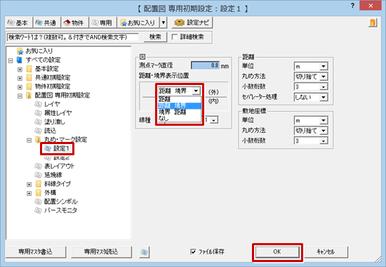 「専用初期設定:丸め・マーク設定-設定1」の「距離・境界表示位置」で表示タイプを選び、「OK」をクリックします。