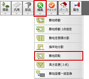 A:「編集」メニューの「敷地回転」で、建物区画と敷地境界線を平行にします。