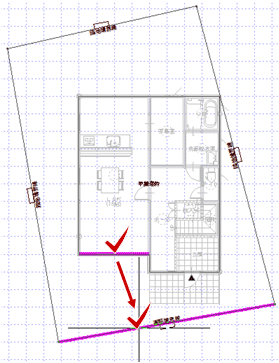 基準となる建物区画の辺をクリック、平行にする敷地の辺をクリックします。
