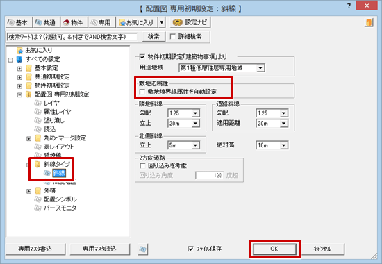- 「専用初期設定:斜線タイプ-斜線」の「敷地境界線属性を自動設定」をOFFにして、「OK」をクリックします。