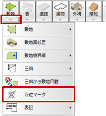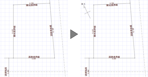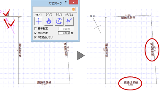 A:「専用初期設定:斜線タイプ-斜線」の「敷地境界線属性を自動設定」をOFFにして、方位マークを入力します。