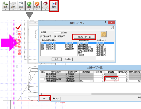 - 敷地の属性ダイアログの「斜線タイプ一覧」からも「公園幅」などを設定できます。