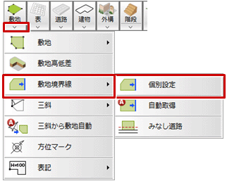 - 配置図を開いて、「敷地」メニューから「敷地境界線」の「個別設定」を選びます。