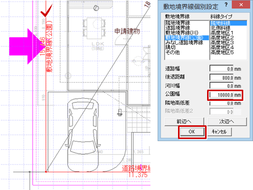 - 敷地境界線(公園)を選んでいることを確認して、「敷地境界線個別設定」ダイアログの「公園幅」を設定して、「OK」をクリックします。