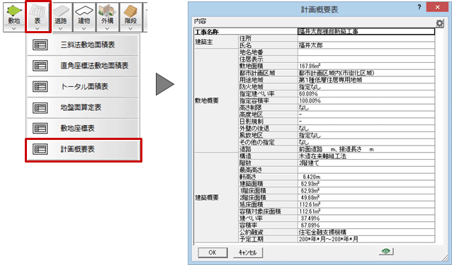 A:配置図の「表」メニューの「計画概要表」で計画概要表を作成します。