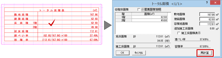 - トータル面積表をクリックして、「トータル面積」ダイアログの「再計算」をクリックします。